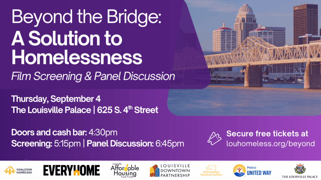 Join the Coalition for the Homeless, Louisville Affordable Housing Trust Fund, Louisville Downtown Partnership, Metro United Way, and Metropolitan Housing Coalition for a special screening of Beyond the Bridge: A Solution to Homelessness, a powerful film that sheds light on homelessness, the urgent need for permanent supportive housing, and provides a roadmap for cities to move toward solving unsheltered homelessness. After the screening, stay for a panel discussion featuring the filmmakers working on real solutions.
