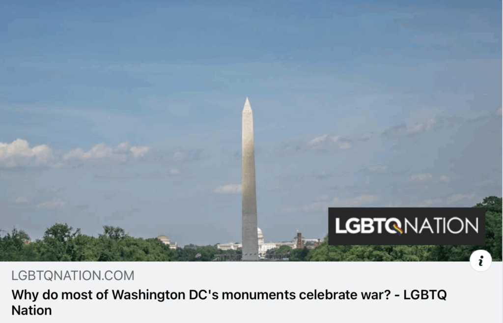 LGBTQ Nation commentary about war monuments refers readers to the US Peace Memorial Foundation. “It’s about time we honor the peacemakers.” Read at www.lgbtqnation.com/2025/06/why-do-most-of-washington-dcs-monuments-celebrate.